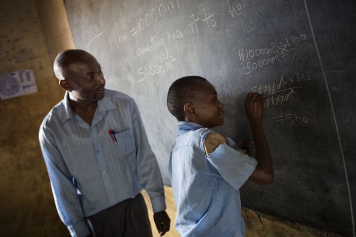 Cornel, 11 anni, alla lavagna con il maestro di matematica, sogna di diventare medico.