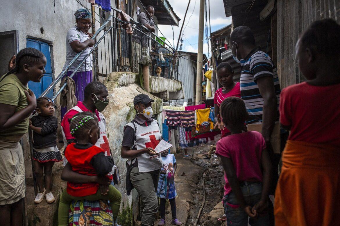 Operatori della Croce Rossa kenyota distribuiscono disinfettanti per le mani ai residenti della baraccopoli di Mathare, a Nairobi, per frenare la diffusione del coronavirus – Foto di Patrick Meinhardt