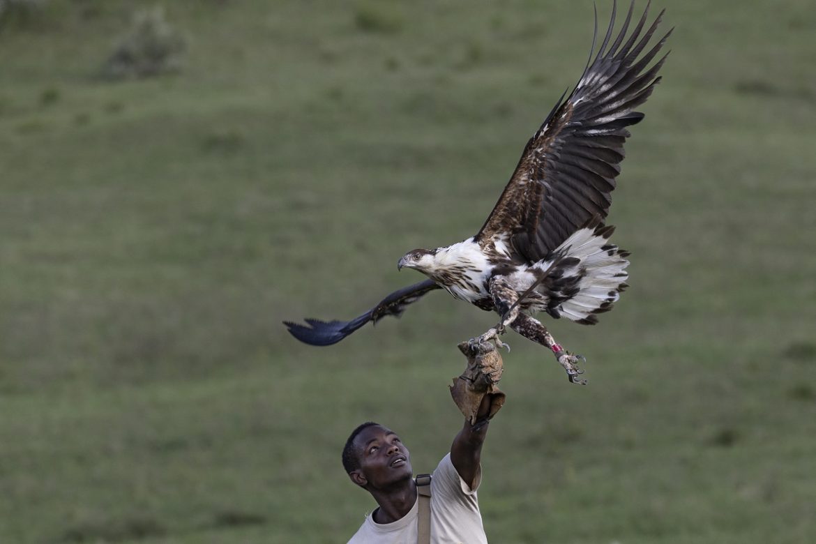 Il tecnico specializzato in rapaci John Kyalo Mwanzia riabilita al volo una giovane aquila pescatrice dopo essere stata curata per le ferite. - Foto di Tony Karumba.