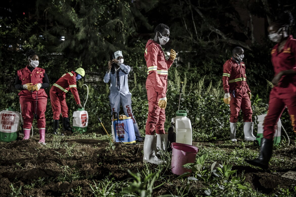 Volontari impegnati nell’attività notturna di sanificazione del City Park Market nell’area di Parklands, Nairobi. In Kenya lo sforzo comune di governo, privati e società civile ha permesso di limitare la diffusione del virus. Foto di Luis Tato / Afp