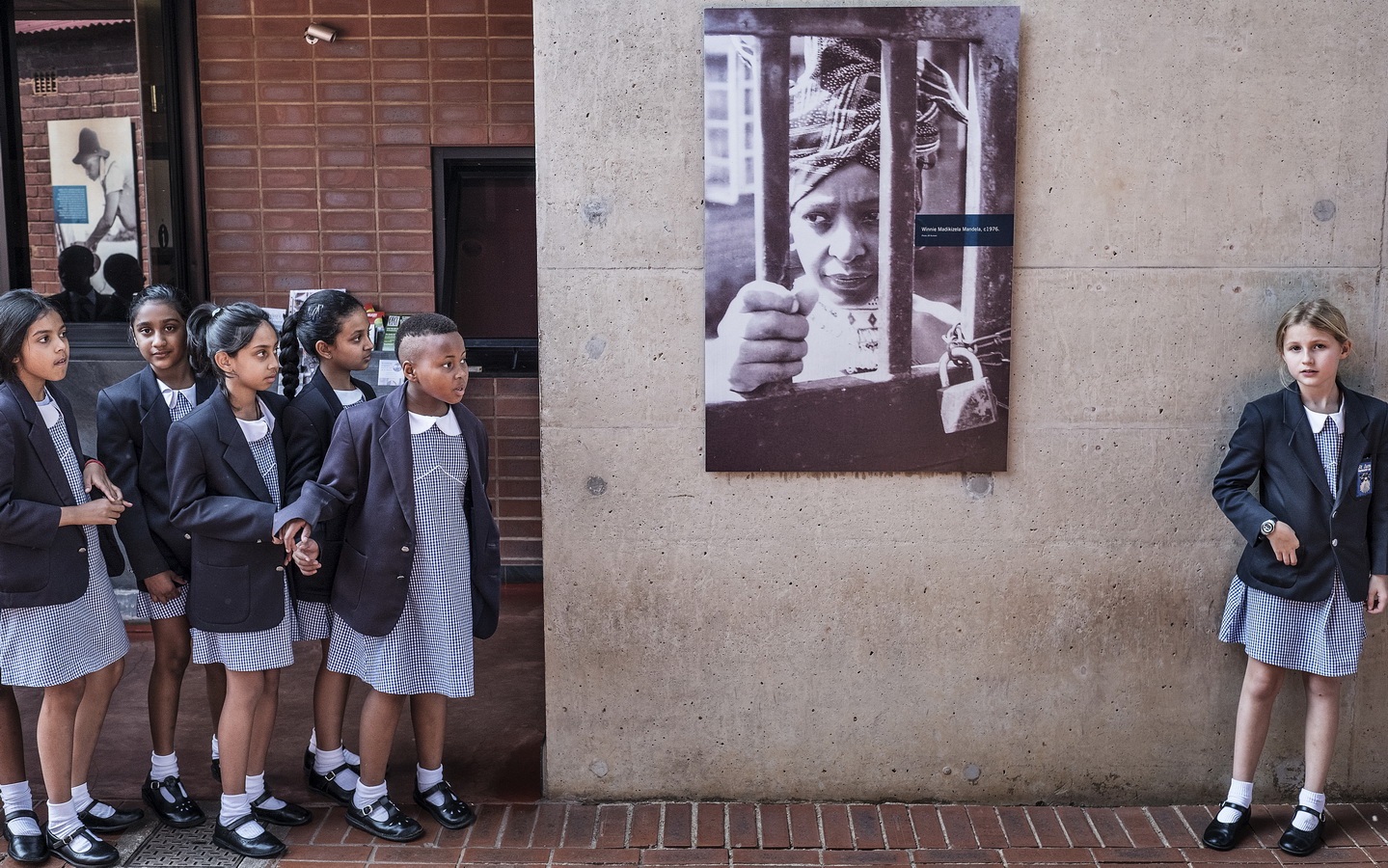 Foto di apertura: bambini sudafricani accanto a un ritratto della defunta attivista sudafricana contro l’apartheid Winnie Madikizela-Mandela, ex moglie del leader dell’African National Congress (ANC) Nelson Mandela, in una visita scolastica nella sua casa il 3 aprile 2018 a Soweto. (Marco Longari / Afp)