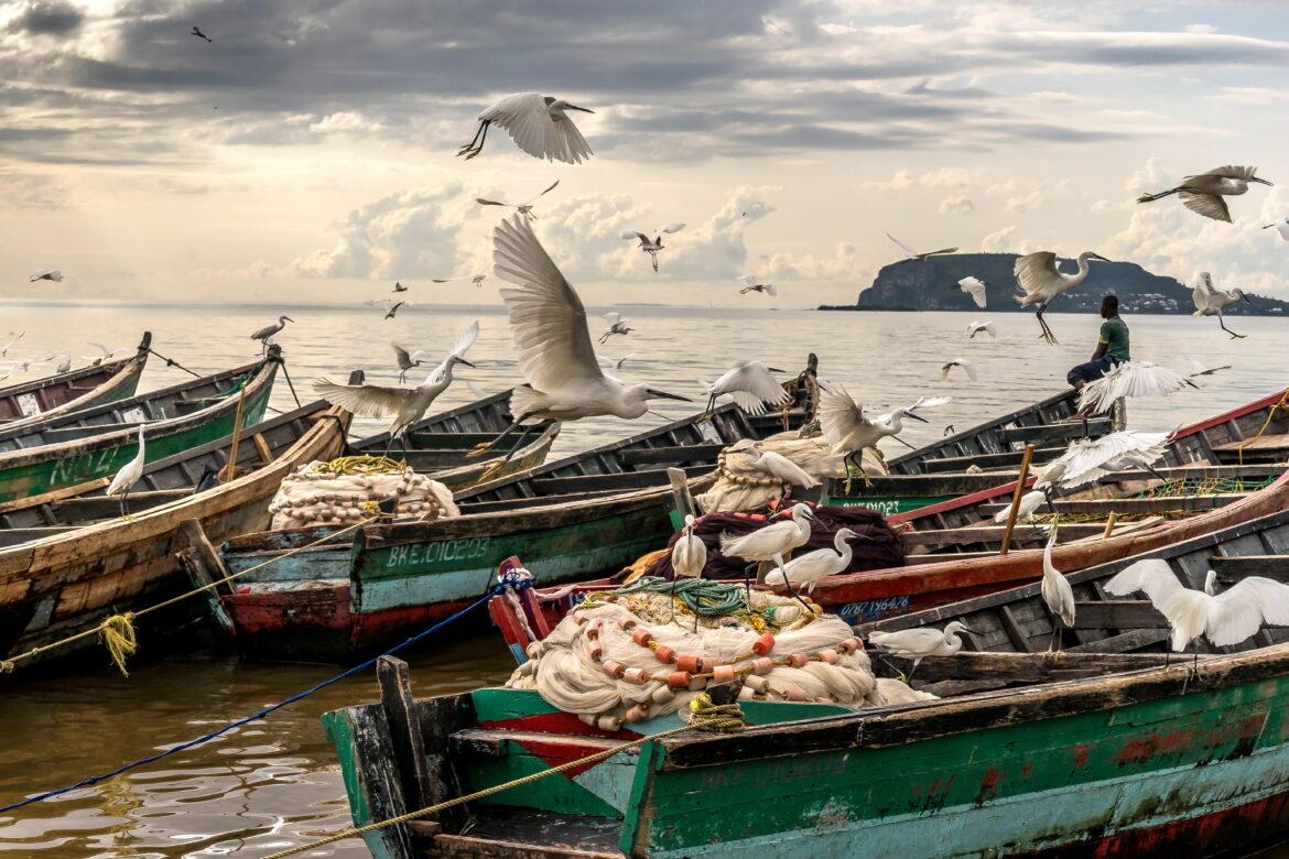 Garzette bianche si accalcano intorno alle barche ormeggiate dei pescatori di dagaa (ciprinidi d’argento), le tipiche sardine del Lago Vittoria. Oggi la pesca è in crisi a causa dell’inquinamento e dello sfruttamento eccessivo delle sue acque – Foto di Frederic Noy/Panos Pictures