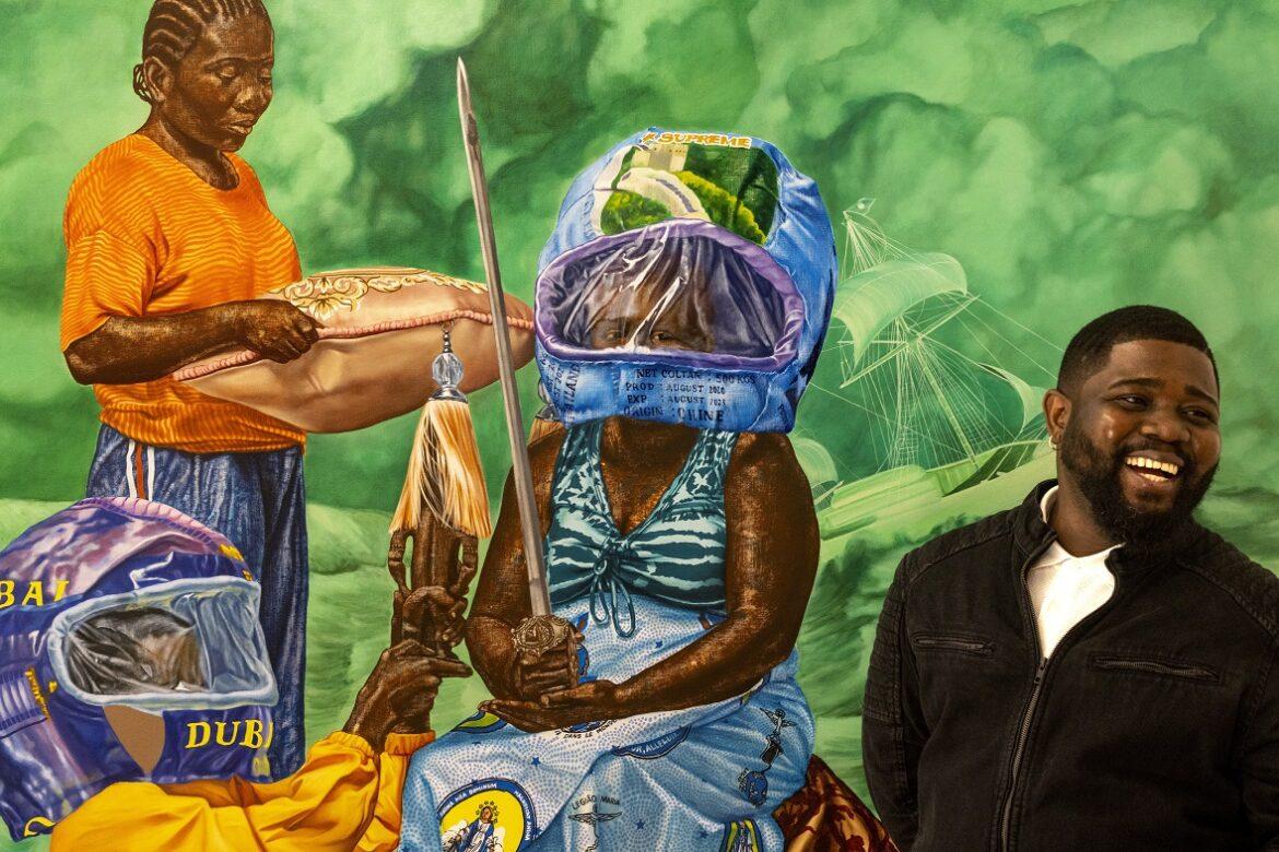 L’artista Hilary Balu con una delle sue opere, Kimbindi wa mundela – Foto di Pascal Maitre / Panos