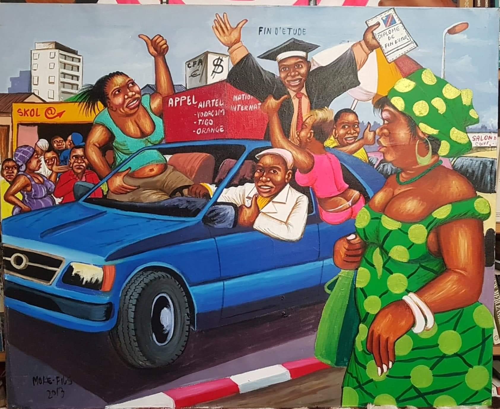 Mi hai fatto la domanda “Chi sono io?”, “Chi è Moké Fils?” Beh, Moké Fils è un artista nato nel 1968. È il figlio maggiore di un grande pittore congolese, un grande pittore africano morto nel 2001. Da lui ho adottato il nome e nel suo laboratorio artistico mi sono formato. Nessuna scuola di pittura o corso di formazione. Ho fatto delle mie passioni il mio lavoro e non ho lasciato nulla al caso. È davvero qualcosa di innato che si è mosso inizialmente tra le scene di vita quotidiana a Kinshasa, capitale della Repubblica Democratica del Congo. Sono come un camaleonte. Sono come lo specchio delle società in cui vivo o soggiorno. Cerco di rappresentare il mio ambiente o la mia società da uno o dall’altro punto di vista.