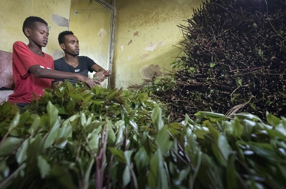 Lavoratori etiopi in un negozio di qa-t ad Aweday. Il prezzo di vendita viene negoziato ogni giorno e dipende dalla domanda e dalla qualità del prodotto – Foto di Pascal Maitre / Panos / Luz