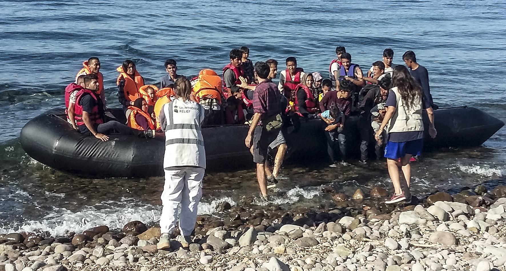 Man mano che la barca si avvicina vediamo anche un altro gommone, decisamente meno carico e molto più agile che gira intorno alla barca dei rifugiati. Sono i volontari della Refugee Rescue, l’altra ong che si occupa del sar (salvataggio in mare). Il ragazzo australiano spiega che le due associazioni si coordinano per il salvataggio. Una esce in mare e, in collegamento con la Guardia Marina Ellenica, segue lo sbarco durante la sua traversata nelle acque greche, dando immediatamente supporto, con giubbotti salvagente e altri primi aiuti. LightHouse Relief li aspetta a terra con le coperte termiche, acqua, biscotti e all’occorrenza allertando il medico. Ed è infatti quello che vediamo accadere sotto i nostri occhi. Le persone a bordo del gommone veloce della Ong parlano e si accordano con gli uomini della Guardia Marina, poi accompagnano i migranti fino a riva.