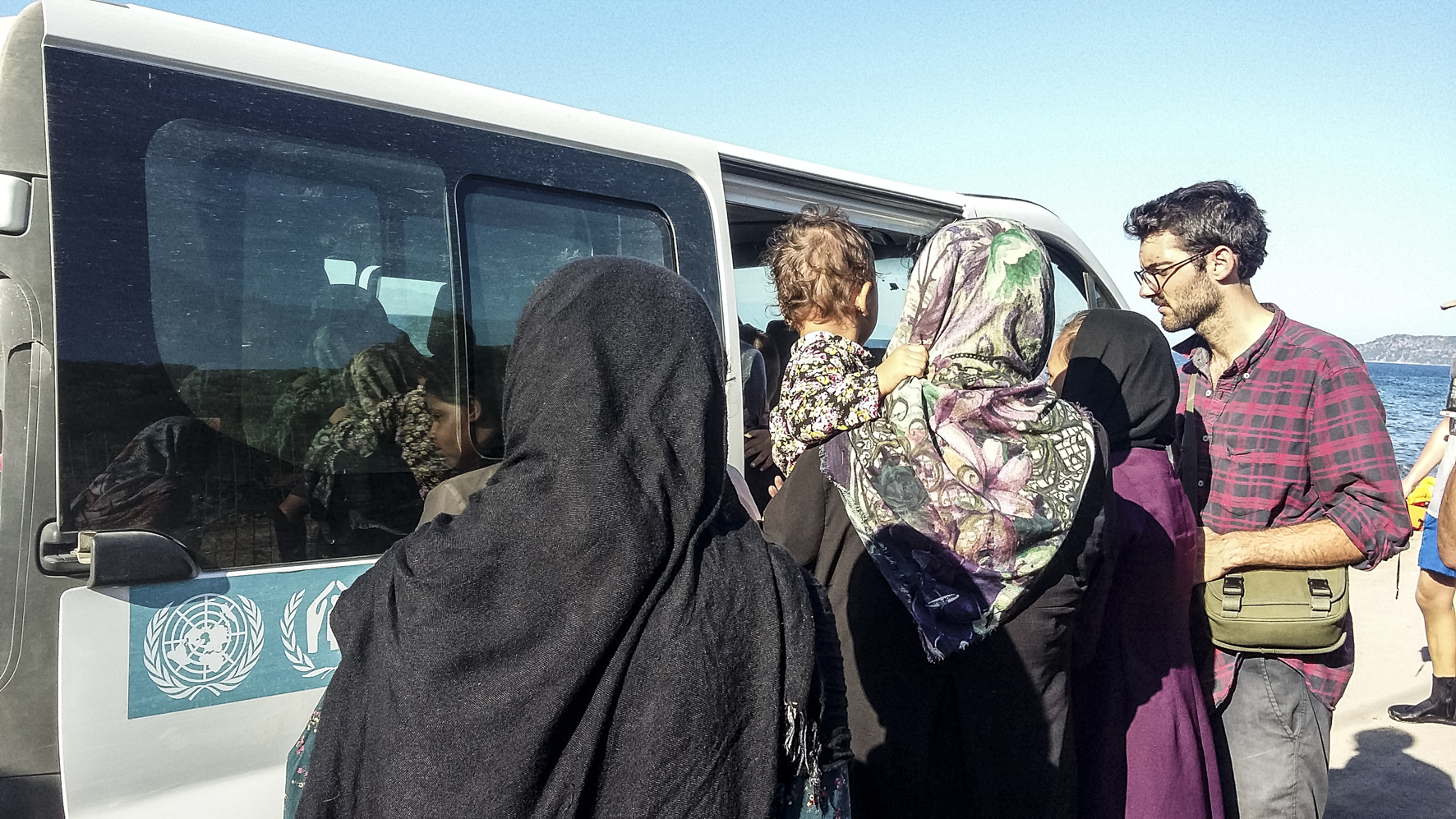 Nel frattempo compare il camioncino dell’Unhcr che inizia a caricare i migranti. Li portano in un campo profughi di appoggio nelle vicinanze, dove rimarranno per poco tempo per poi essere destinati ai due grandi campi: Moria e Kara Tepe.
