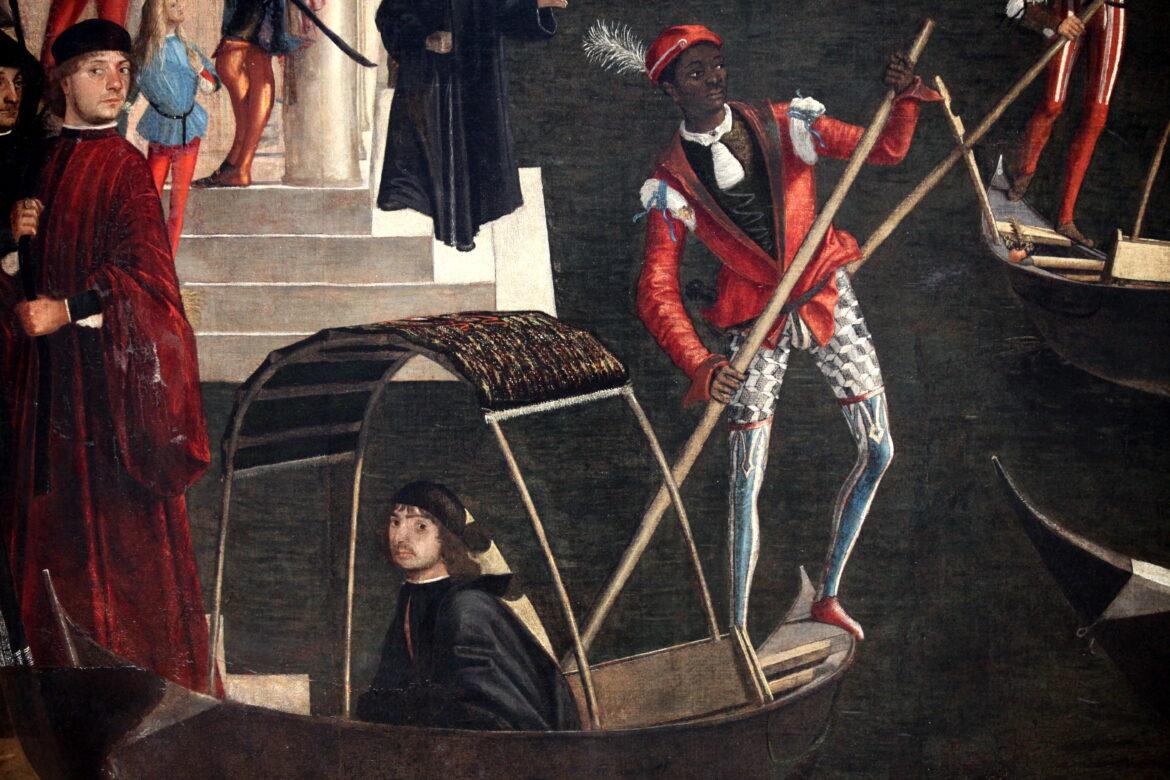 Già dal Quattrocento la pittura ci restituisce un’immagine dei grandi centri urbani della penisola con una tangibile presenza di comunità africane. Per esempio, illustri pittori quali Vittore Carpaccio (Miracolo della reliquia della Croce al ponte di Rialto – foto) e Gentile Bellini (Miracolo della reliquia della Croce al ponte di San Lorenzo) ci presentano una Venezia in cui erano comuni i gondolieri africani. Ex schiavi liberati avevano trovato in questa attività non solo una fonte di sostentamento ma anche uno strumento di integrazione sociale, tramite il sistema associazionistico delle cosiddette “scuole”. Analogamente è attestata l’esistenza di confraternite religiose di africani liberi nelle città di Palermo, Napoli e Messina già dagli inizi del Cinquecento.