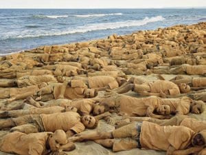 Nel ciclo Migrants, oltra a ritrarsi in versione camaleontica su una sezione dello sfondo iconico, Bolin ha coinvolto in altri quattro scatti giovani migranti africani alloggiati in diversi centri di accoglienza temporanea in Sicilia. Per realizzare Memory Day, ha dipinto il corpo di 200 di loro con un color ocra sabbia e li ha fatti sdraiare, uno accanto allāaltro, sulla stessa spiaggia su cui sono approdati. Ā«Possono sembrare cadaveri, ma il mio intento era descriverne lāarrivo e lāinizio del loro futuro. Nello scatto alcuni migranti hanno gli occhi aperti e guardano in avanti come se stessero scrutando il futuro. Sono convinto che gli africani lascino il loro continente proprio per la speranza di avere un avvenire miglioreĀ», spiega Bolin. Memory Day ĆØ uno scatto Ā«struggenteĀ», come lo definisce la curatrice Beatrice Benedetti, di Boxart Gallery. «à una distesa umana paradossalmente tra la vita e la morte. In questo caso sono superstiti, la grande maggioranza delle persone fortunatamente si salva, ed ĆØ proprio il segnale che Liu Bolin voleva dareĀ». In mostra nello spazio Mudec Photo si trova anche il video di 11 minuti che racconta il backstage del progetto e presenta uno stralcio di toccanti interviste ai ragazzi migranti coinvolti nel concept. Bellissimi gli zoom sui loro sguardi, tra il fiero e il divertito. Sguardi di speranza e di soddisfazione nel partecipare a unāopera collettiva su di loro. Bellissime anche le sequenze video dei ragazzi dellāAccademia di Catania che, accanto al team tecnico-professionale al seguito di Bolin, hanno partecipato al progetto dipingendo con gesti lenti, delicati e rispettosi i corpi e i volti dei migranti africani.