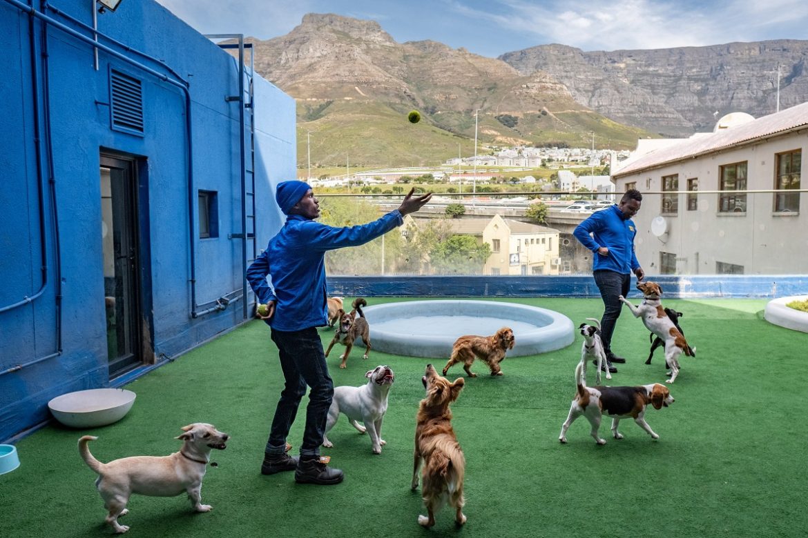 Lo staff del Superwoof Dog Hotel di Città del Capo gioca con gli ospiti sul terrazzo panoramico, che si affaccia su un rifugio notturno per senzatetto.