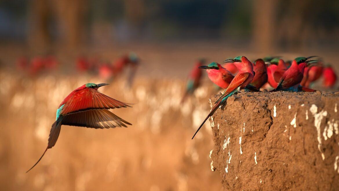 Quando gli stormi del gruccione carminio giungono nella Valle dello Zambesi, al culmine della stagione secca, la boscaglia si tinge del rosso colore delle sue piume, pennellando di rinnovata brillantezza gli aridi colori del panorama invernale