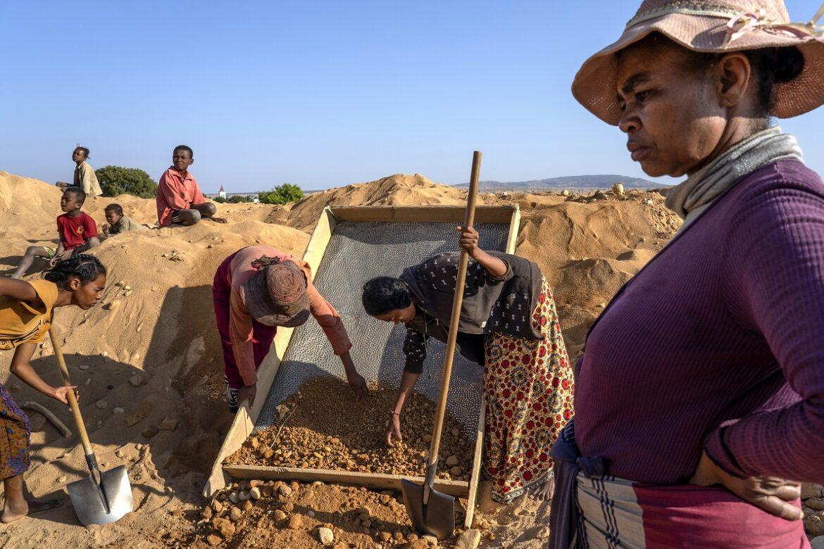 Donne e bambini sono spesso impegnati nel faticoso lavoro di setacciare la terra portata in superficie dai minatori, in cerca di gemme di zaffiri. – Foto di Tariq Zaidi