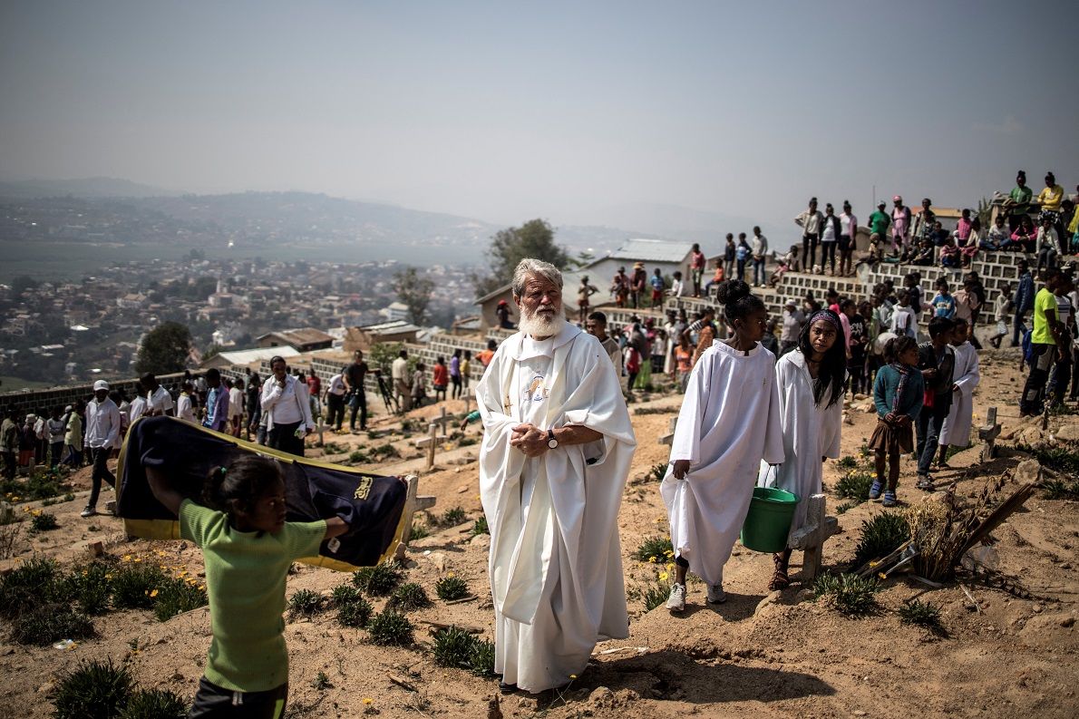 Padre Pedro Opeka nel cimitero di Akamasoa ad Antananarivo. Con l’aiuto di collaboratori e benefattori, sostiene circa trentamila persone in 18 villaggi, tra cui diecimila bambini. – Foto di Marco Longari / Afp