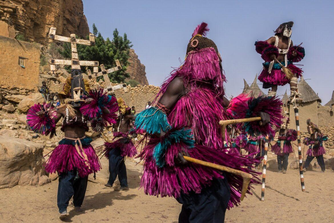 Danze tradizionali dogon con maschere rituali in un villaggio sulla Falesia di Bandiagara, Mali.