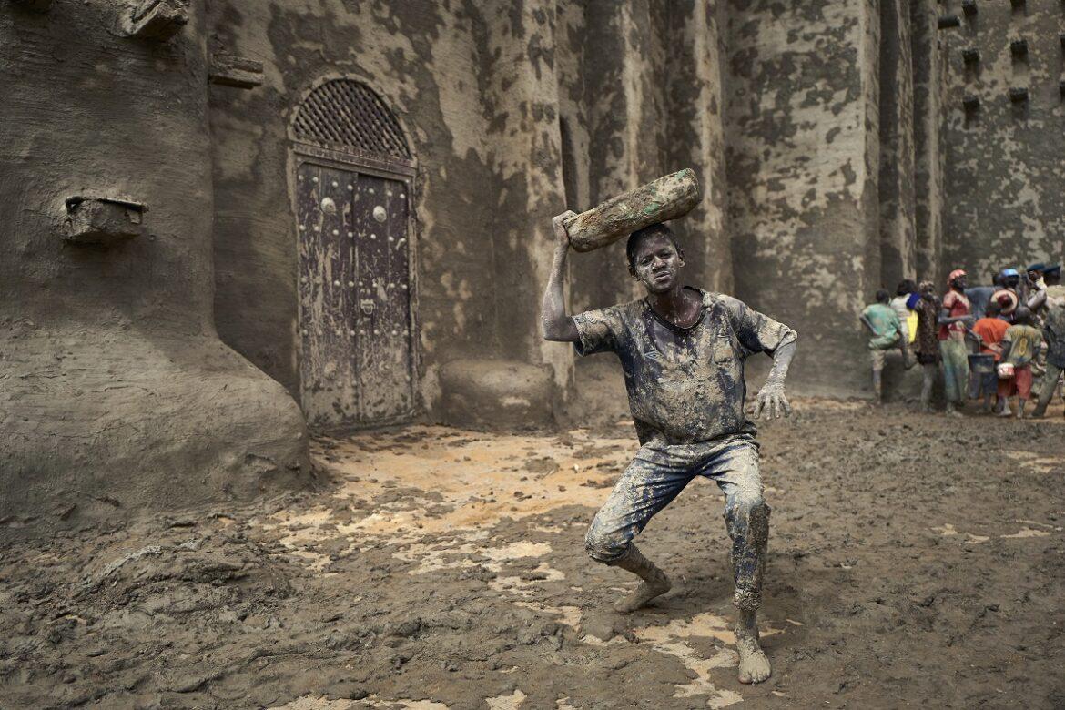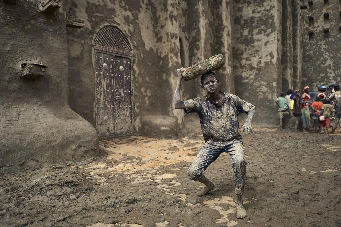 I portatori, come il ragazzo ritratto nella foto, hanno il compito di prelevare il fango al fiume e passarlo ai muratori, che si arrampicano sui pioli della moschea reggendosi alle travi mozze che punteggiano i torrioni. – Foto di Michele Cattani/Afp