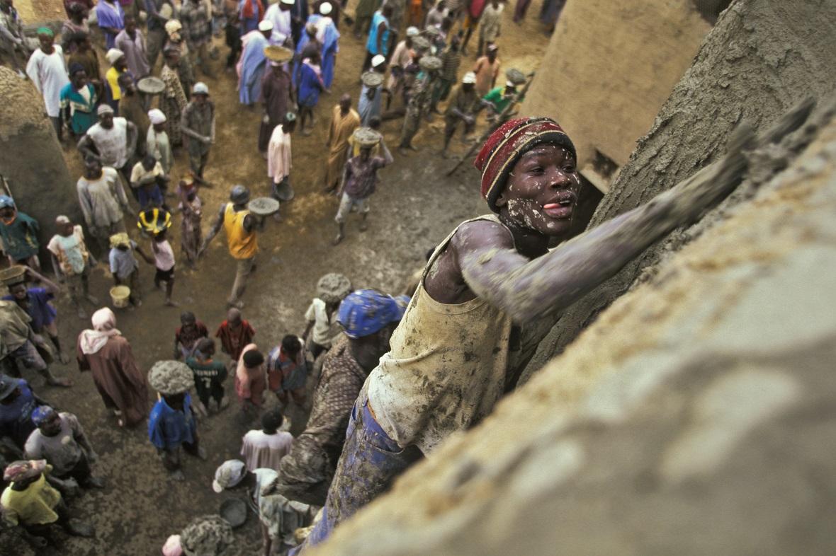 Come free-climber in bilico sulla parete, i muratori di Allah lisciano il fango con le mani. Poi salgono ancora, verso i minareti. I cesti di fango passano di mano in mano mentre i tamburi scandiscono il lavoro. Foto di Bruno Zanzottera / Parallelozero