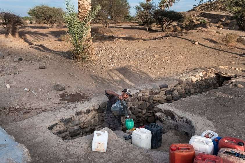 Nell’oasi di N’Kob si riempiono contenitori per l’acqua da una khettara, un canale d’acqua sotterraneo. In molti villaggi ai piedi delle montagne dell’Atlante, i pozzi sono quasi asciutti. – Foto di Vincenzo Montefinese