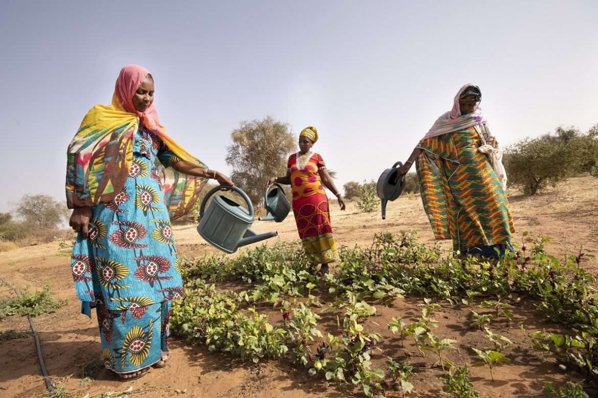 Donne mauritane che irrigano il loro orto comunitario, parte dell’ambizioso progetto Grande Muraglia Verde che si estenderà per 8.000 chilometri nell’Africa sahelo-sahariana e che mira a ripristinare 100 milioni di ettari di terra degradata. – Foto di Simon Townsley/ Panos