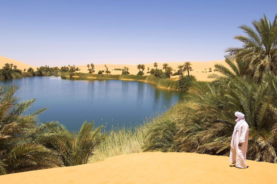 All’improvviso, tra le sabbie, giù in fondo, spunta uno spicchio di blu orlato di palme. I laghi incastonati tra le dune dell’Erg di Ubari, alimentati da una falda sottostante e profondi diversi metri, residuo di una delle epoche umide sahariane, sono numerosi, una ventina, ma i più frequentati sono Mandara, Um el Màa e Gabraòn. Sembrano l’immagine paradigmatica dell’oasi nel deserto, l’acqua agognata dopo una lunga traversata.