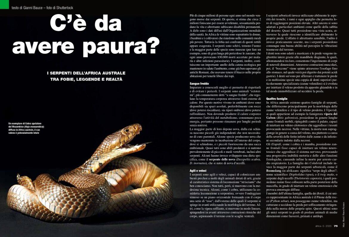 Un esemplare di Cobra sputatore del Mozambico (Naja mossambica): diffuso in Africa australe, il suo veleno è potenzialmente letale. – Foto di copertina tratta dal servizio “C’è da avere paura?” a firma di Gianni Bauce, pubblicato sull’ultimo numero della rivista Africa. Un viaggio tra i serpenti dell’Africa australe, tra fobie, leggende e realtà.