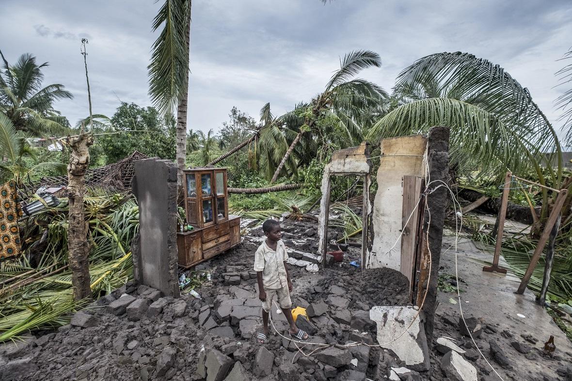 Un ragazzo tra le macerie della sua casa a Macomia, in Mozambico, dopo che la città è stata colpita dal ciclone Kenneth, che nell’aprile del 2019 ha seminato devastazione e morte con venti che soffiavano fino a 230 km/h. Il Mozambico è colpito da fenomeni meteo estremi sempre più frequenti – Foto di Tommy Trenchard/Panos Pictures