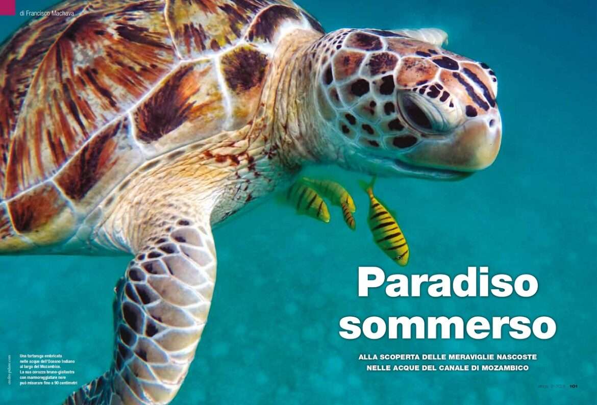 Una tartaruga embricata nelle acque dell’Oceano Indiano al largo del Mozambico. La sua corazza bruno giallastra con marmoreggiature nere può misurare fino a 90 centimetri. – Copertina dell’articolo “Paradiso sommerso” pubblicato sull’ultimo numero della rivista.