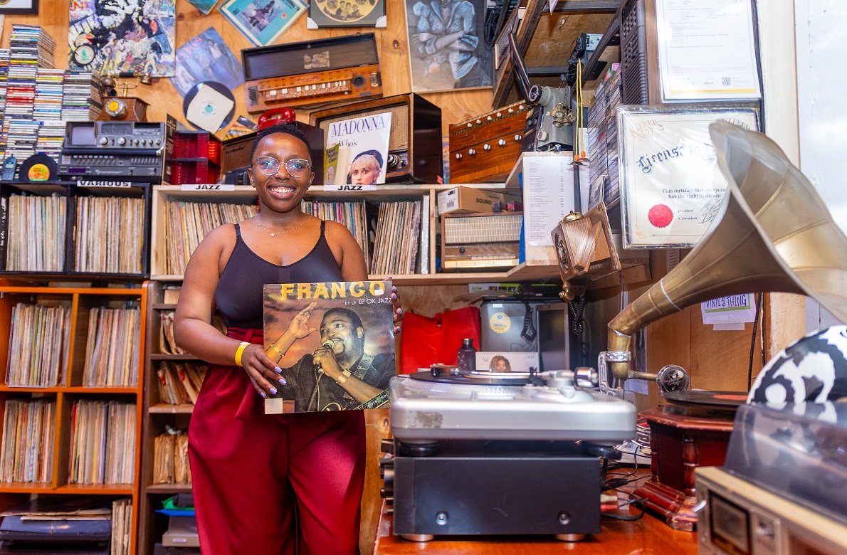 Nairobi: una cliente all’interno del negozio di Jimmy Rugami, specializzato nella vendita di vinili di seconda mano e nel restauro di giradischi d’epoca.