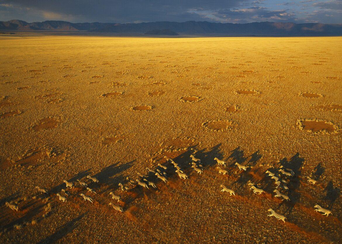 Anelli d’erba. Mandria di zebre nella riserva naturale del Namib Rand in Namibia – Foto di George Steinmetz tratta dalla mostra fotografica Africa in Volo.