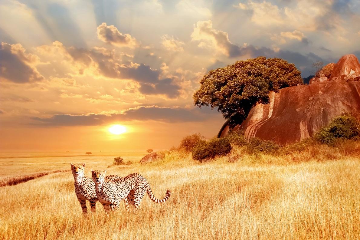 Due ghepardi nella savana. Un tempo, tra l’Africa e l’Asia c’erano più di centomila esemplari di questi felini; oggi ne restano circa settemila, concentrati in aree protette di sei Paesi africani – Foto di
