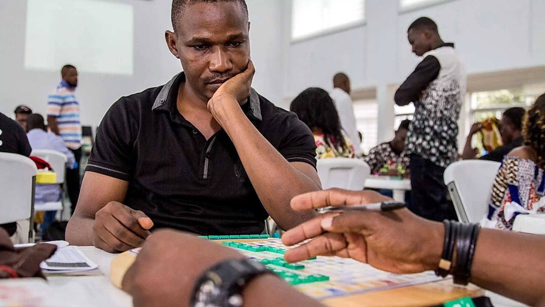 Il campione di Scrabble (scarabeo inglese) Wellington Jighere, 38 anni, durante una partita.
