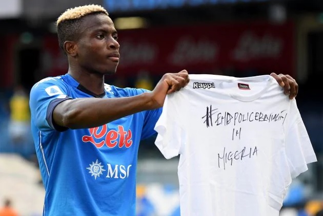 Dopo i rispettivi gol contro la Juve e l’Atalanta, l’attaccante del Crotone e giocatore della nazionale nigeriana Simeon Tochukwu Nwankwo, detto Simy, e il centravanti del Napoli, Victor Osimhen, hanno esibito davanti al pubblico e alle telecamere, pugno alzato, magliette con scritto a mano #endpolicebrutality in Nigeria.