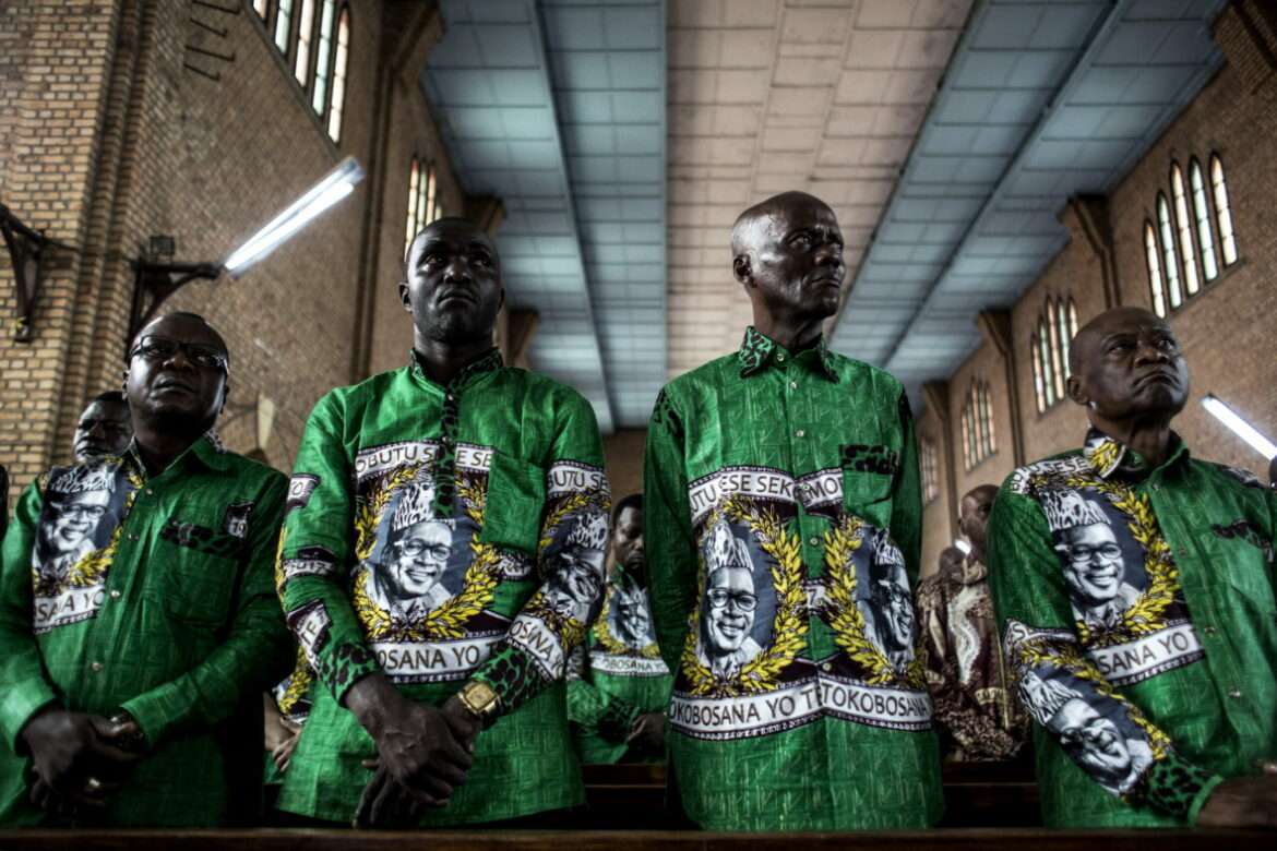 Nostalgici di Mobutu Sese Seko (al potere dal 24 novembre 1965 al 16 maggio 1997), ex dittatore dello Zaire, raffigurato sulle casacche verdi, partecipano a una messa commemorativa nella cattedrale di Kinshasa – Foto di John Wessels