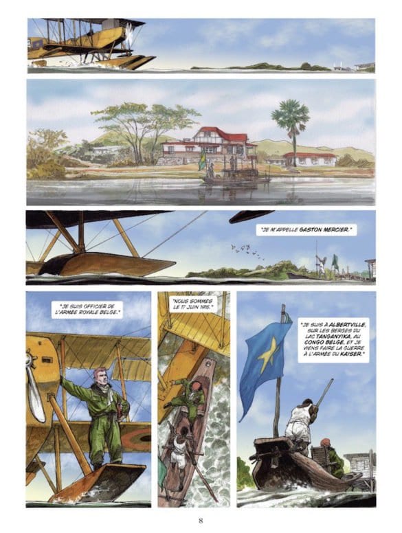 Insieme a Gaston e Livingstone staremo sulle tracce del von Goetzen. Sorvoleremo a bordo dell’idrovolante le lussureggianti sponde del lago. Attraverseremo a passo d’uomo gli splendidi altopiani, le ricche foreste e i villaggi dei Grandi Laghi. Tramite gli occhi e le conoscenze di Livingstone, Gaston comincerà a vedere la guerra e il suo tragico impatto sulle popolazioni in modo diverso. In questo viaggio attraverso la storia, osserveremo il mutare del loro rapporto da commilitoni ad amici. «Qui, la guerra, così come le frontiere sul lago, è solamente un affare di bianchi. E gli affari dei bianchi, come sapete, non sono mai un buon affare per i neri».