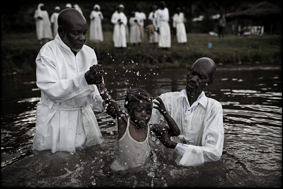 Sulle acque del Lago Kivu, vicino a Bukavu, si tiene il battesimo di un nuovo discepolo della Chiesa dei Nuovi Apostoli. Questa setta cristiana è stata fondata da Humbowo Hutswa, autoproclamato “profeta di Cristo”, che afferma di avere ricevuto un’illuminazione divina in sogno e l’ordine di diffondere il (suo) Vangelo. I suoi fedeli si rasano i capelli e indossano tuniche bianche «per respingere l’aggressione degli spiriti maligni» – Foto di Marco Gualazzini