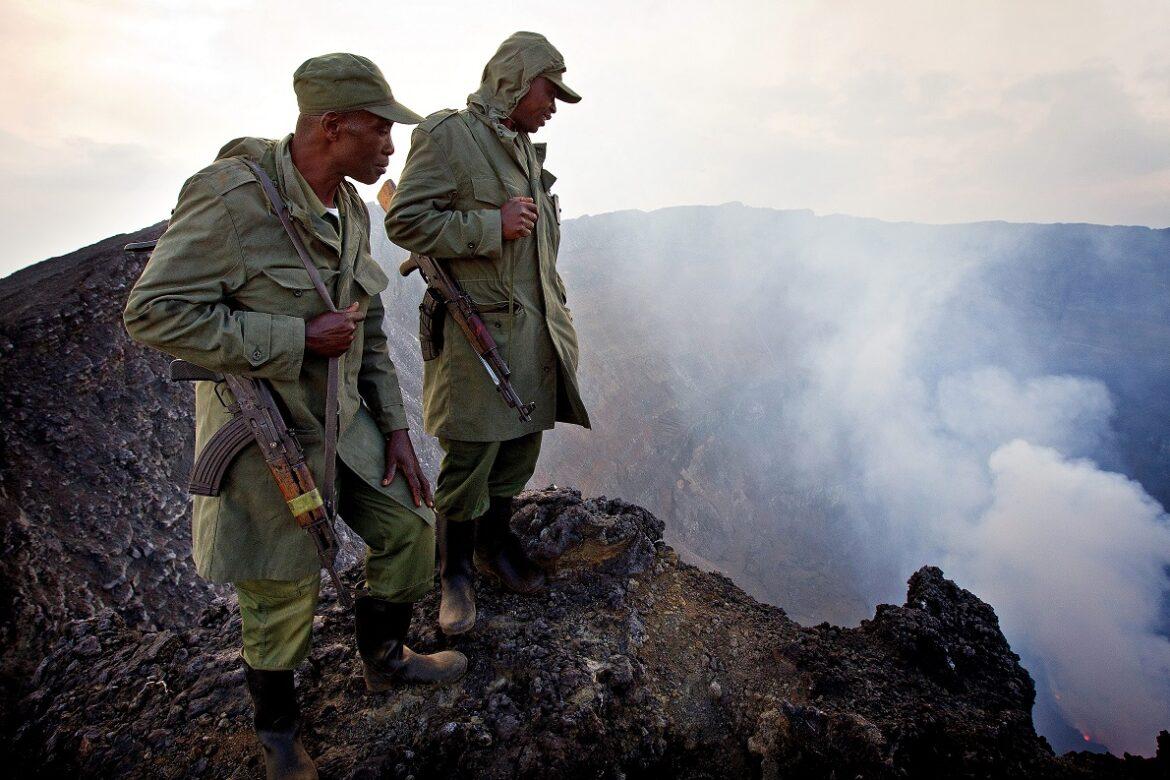 Due guardie del Parco Nazionale del Virunga osservano il cuore incandescente del Nyiragongo dal bordo del cratere principale. – Foto di Kris Pannecoucke