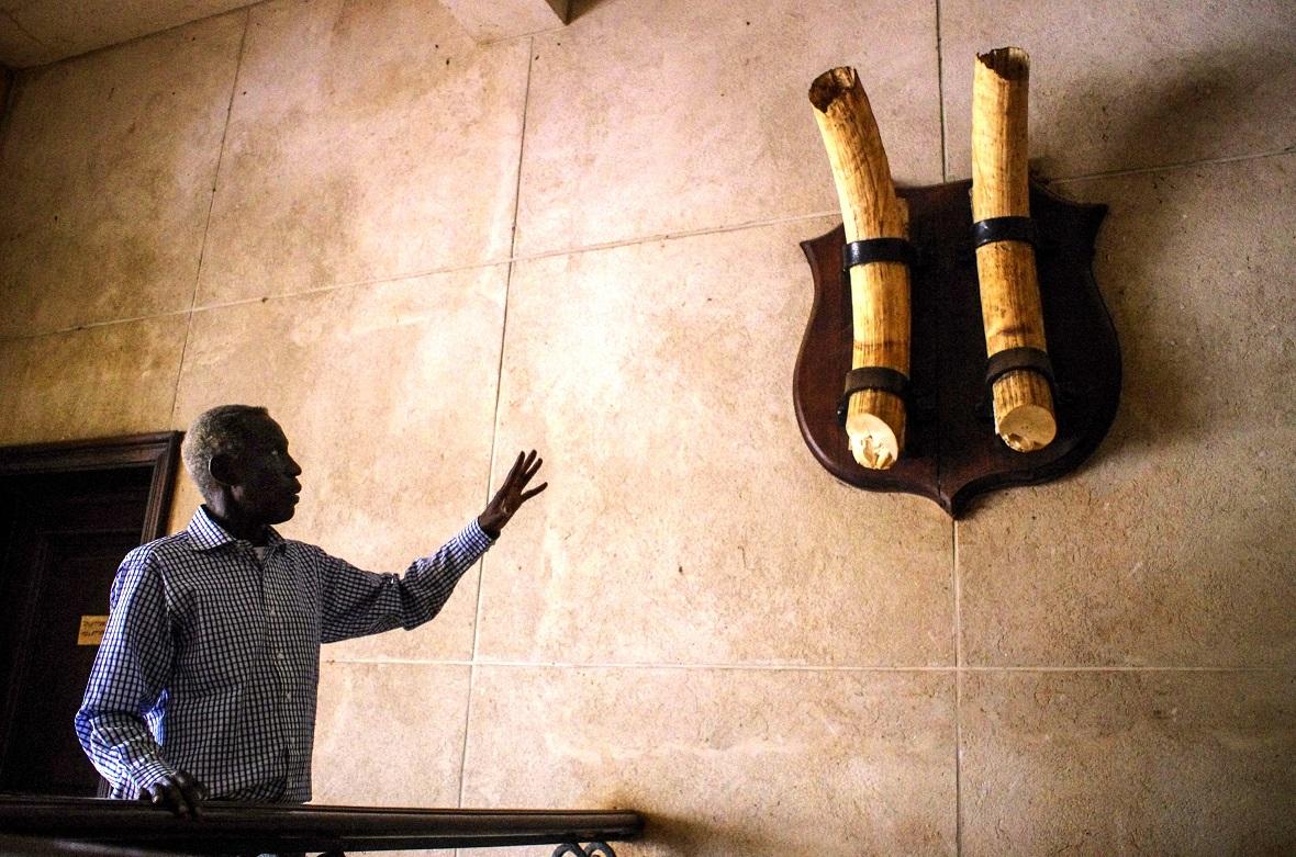 Jean-Pierre Baluku Bajope, direttore del Centro di Ricerca in Scienze Naturali di Lwiro, mostra i resti delle zanne di elefante più grandi del mondo. Le parti di zanne mancanti, lunghe più di 3 metri, sono state rubate all’inizio degli anni Novanta – Foto di Marc Jourdier