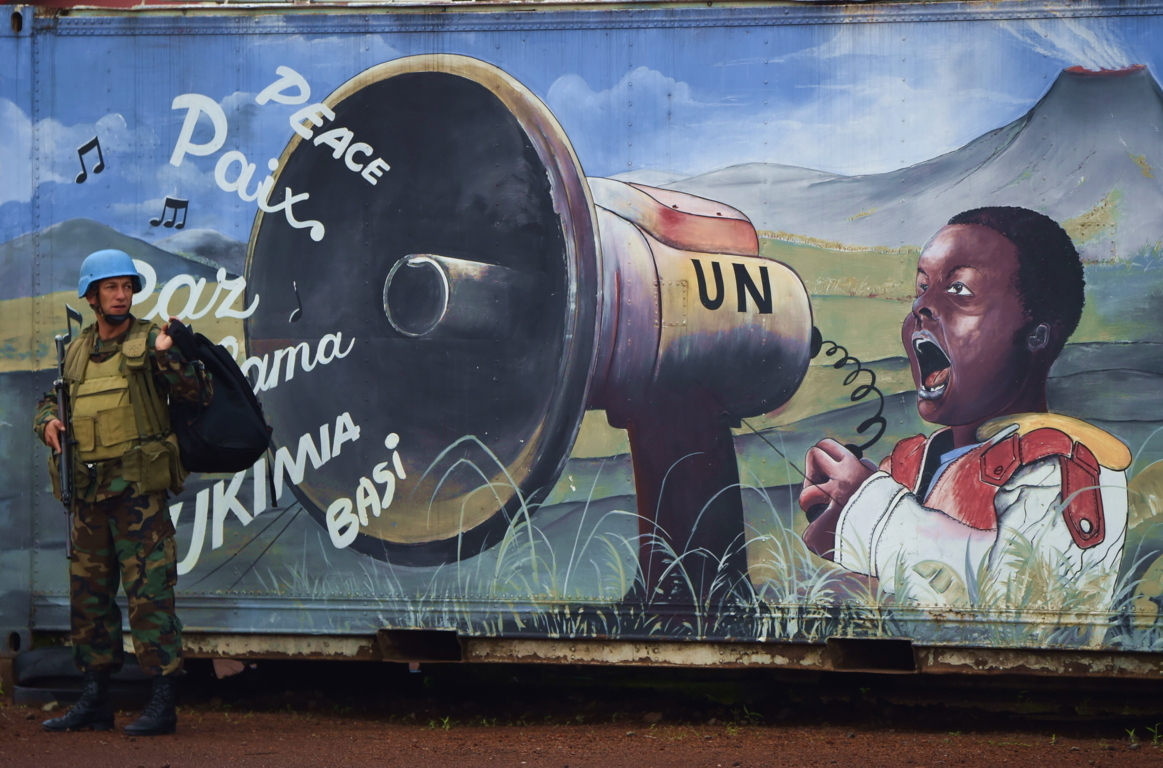 Un soldato uruguaiano delle Nazioni Unite davanti a un murale che inneggia alla pace a Goma, capitale del Nord Kivu. – Foto di Pablo Porciuncula