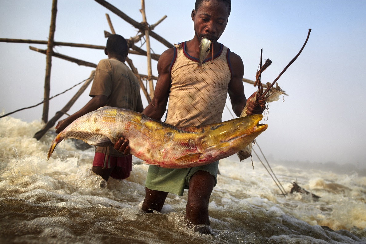 Un pescatore con una preda. A Kisangani, (Repubblica Democratica del Congo) dove l’acqua spumeggiante urla la sua forza, gli ultimi funamboli delle cascate vivono in simbiosi con il grande fiume. – Foto di Andrew McConnell / Panos