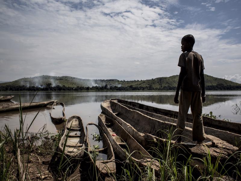 Sulle rive del fiume Ubangi, che segna il confine tra Repubblica Centrafricana e Repubblica Democratica del Congo, un ragazzo osserva il fumo che si alza dal villaggio di Mobaye finito sotto attacco da parte di una milizia Seleka. – Foto di John Wessels