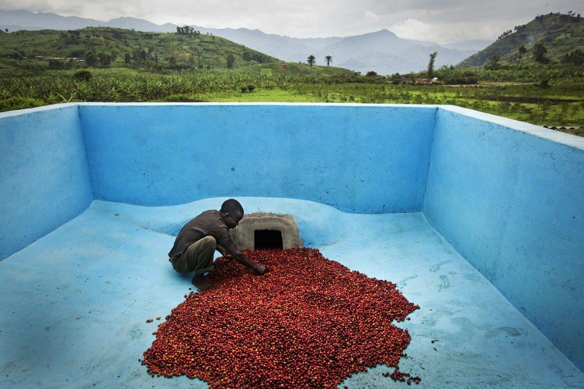 Bukavu, Repubblica Democratica del Congo, Un uomo seleziona i chicchi di caffè lavati con l’acqua in un serbatoio di cemento. Trent’anni di guerra e cattiva gestione hanno devastato le piantagioni del Kivu. Ora si sta tentando di rilanciare la produzione di caffè di qualità con le esportazioni del commercio equo verso l’Europa. – Tim Dirven /Panos Pictures