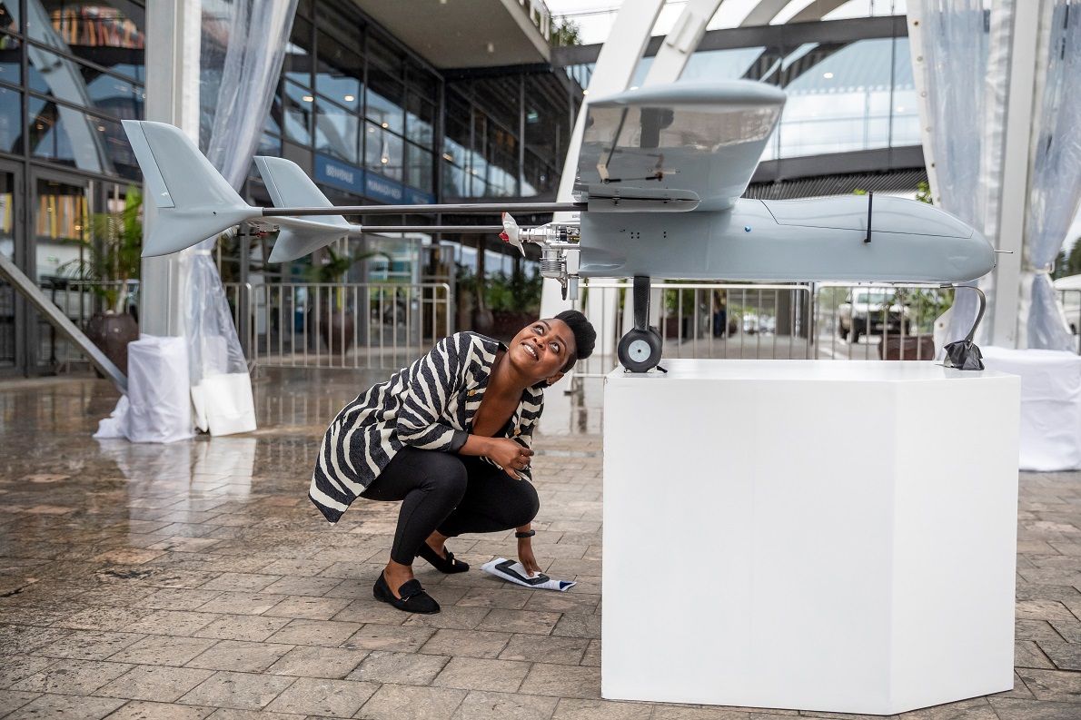 Una donna osserva un drone per uso civile esposto all’African Drone Forum, principale fiera del settore, ospitata presso il Kigali Convention Centre. In basso, due dipendenti della società Zipline verificano un prototipo di drone in fase di sviluppo. – Foto di Sven Torfinn / Panos