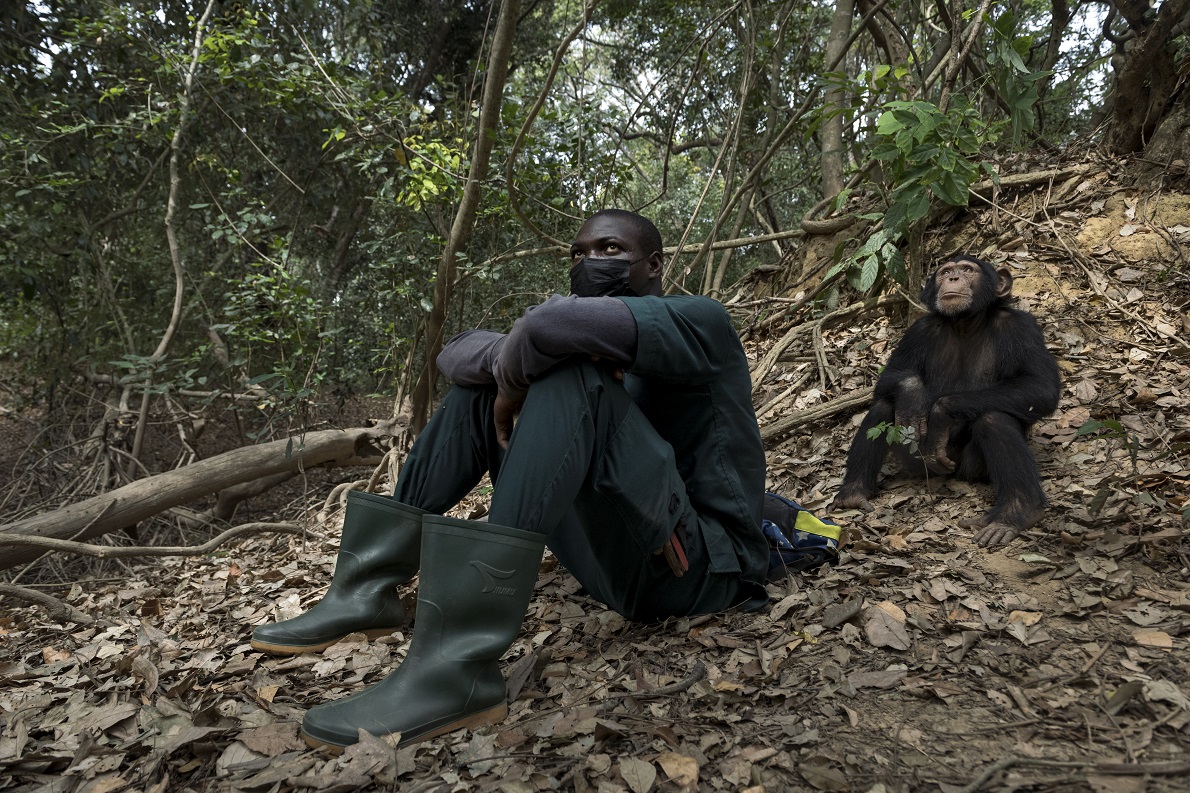 Saliou, assistente del Centro di Conservazione degli Scimpanzé, osserva insieme al suo scimpanzé César il resto del gruppo giocare tra gli alberi. – Foto di Guillaume Petermann