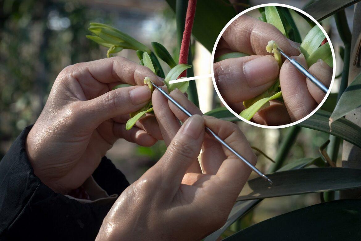 L’impollinazione della vaniglia: questa procedura viene effettuata a mano, trasferendo il polline sullo stigma del fiore, nell’unico giorno in cui il bocciolo si schiude.