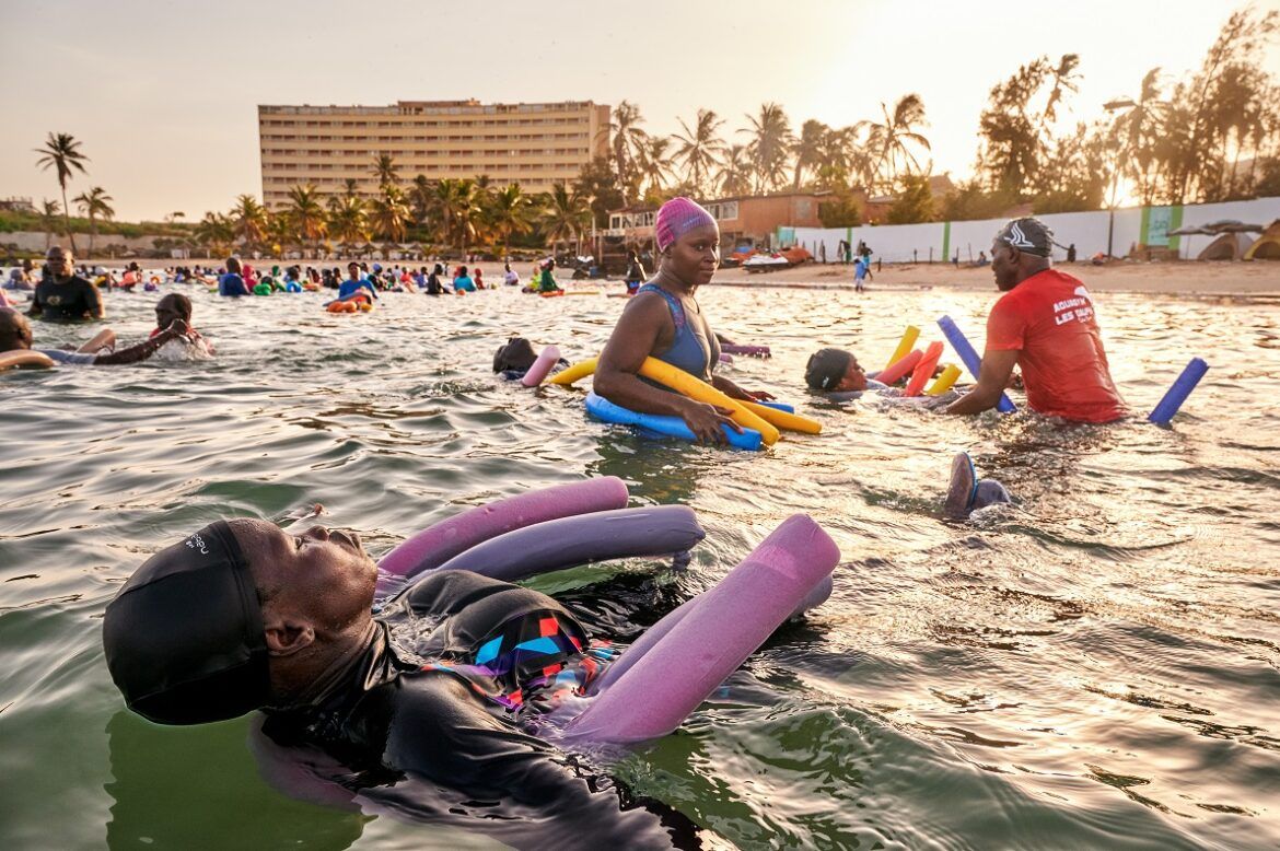 Membri del club di acquagym “Les Dauphines” sulla spiaggia di Ngor. La crescita economica del Senegal registrata negli ultimi dieci anni ha fatto aumentare il potere di acquisto della classe media. – Foto di Christian Bobst