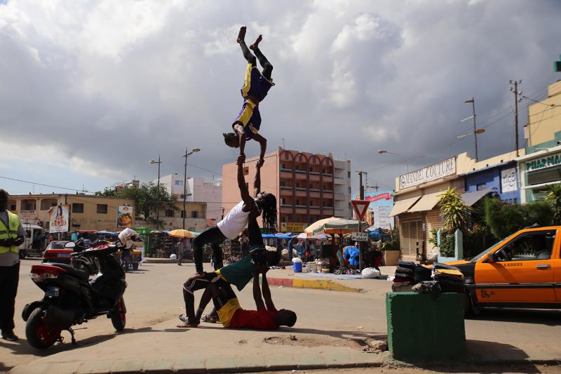 Esercizi circensi a Dakar. Il Sencirk è la prima e unica compagnia di circo del Senegal, composta da 15 artisti professionisti e guidata da Modou Touré, ex bambino di strada. – Foto di Luciana De Michele