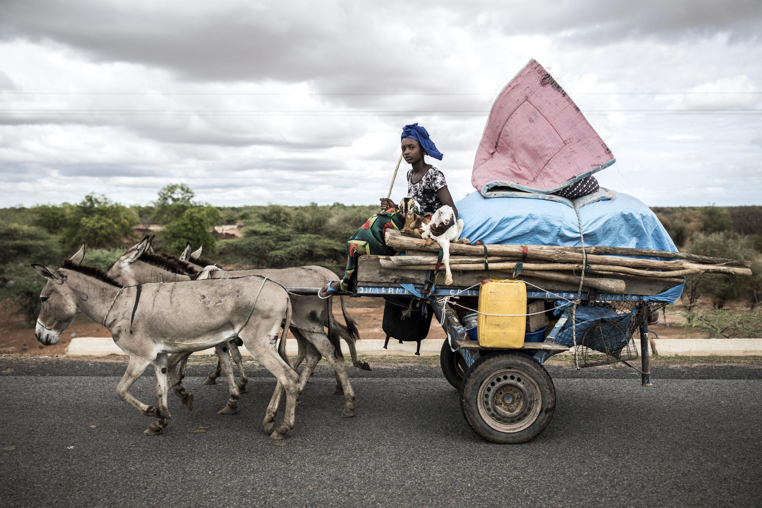 Una giovane fulani trasporta due pecorelle sul suo carretto verso il nord del Senegal, dove le prime piogge hanno portato erba fresca e acqua per il bestiame di questo popolo di pastori – Foto di John Wessels