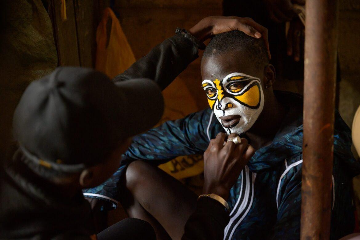 Dakar: lo spettacolo di strada Simb Gaïndé è una tradizione popolare senegalese nota anche come “Les Faux Lions” (I falsi leoni). Prima di ogni performance, al riparo dallo sguardo degli spettatori, i giovani si truccano e si travestono per prendere le sembianze dei felini. – Foto di Christian Bobst