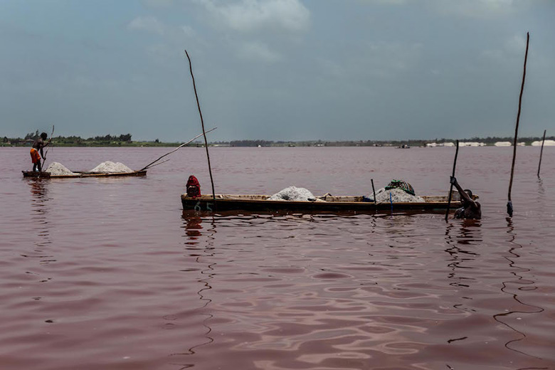 Lui si chiama Amadou Sangarè, è maliano, e emigra stagionalmente per lavorare sette mesi all’anno nel lago. Come lui, fanno tanti altri suoi compatrioti, ma anche molti guineani dell’etnia manjaco. Il resto dei lavoratori sono senegalesi di etnia serer e peul, abitanti dei villaggi circostanti. In tutto sono in 400, a mandare avanti ogni giorno l’attività della grande salina rosa. A parte i proprietari e i lavoratori dei ristoranti e degli alloggi per turisti, le guide, le venditrici di bigiotteria e oggetti di artigianato e i venditori di tavolette con dipinti di sabbia, i veri protagonisti sono loro: i piroghieri che estraggono il sale dal lago e, soprattutto, le donne che ne trasportano decine di chili dalla riva al deposito assegnato, con pesanti catini issati sul capo.