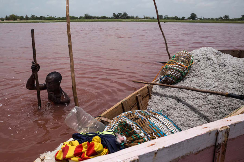 Il lago infatti non è di proprietà di nessuno, se non degli abitanti della regione: l’unica imposta che i mercanti pagano è di 1000 FCFA (1,5 euro) per ogni tonnellata di sale venduto al Comitato di Gestione del Lago Rosa: abitanti dei 5 villaggi del territorio, che si sono organizzati per gestire e controllare collettivamente il business. Il guadagno, oltre che per pagare la decina di persone che ci lavora, è destinato a realizzare opere sociali nei villaggi. Un paradiso per i commercianti di uno dei prodotti più richiesti al mondo. Un inferno per chi ci lavora. «Venite, fate pure il bagno, il sale attacca solo dopo 15 minuti», assicurano le guide ai turisti. Gli uomini e le donne a riva, immersi costantemente in acqua, piroghe al lato e catini in testa, sorridono sarcastici
