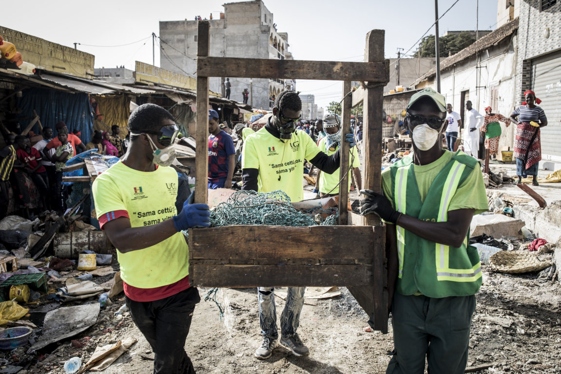 Addetti del comune di Dakar smantellano i banconi di un mercato informale nell’ambitodelle disposizioni anticontagio contro il coronavirus. – Foto di John Wessls